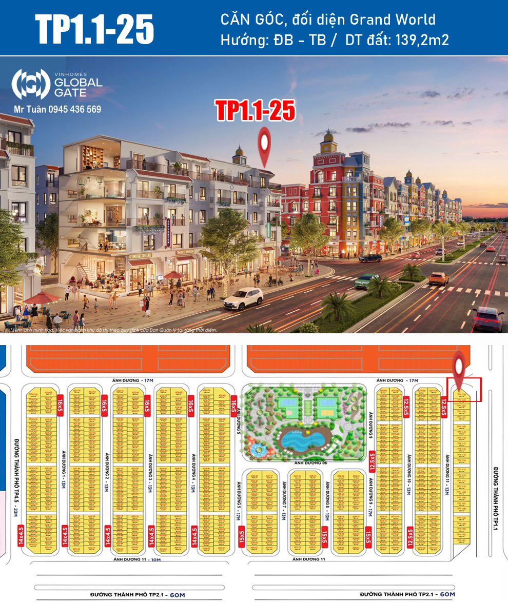 SHOPHOUSE TP1.1-25 GÓC, ĐỐI DIỆN Grand World Cổ Loa