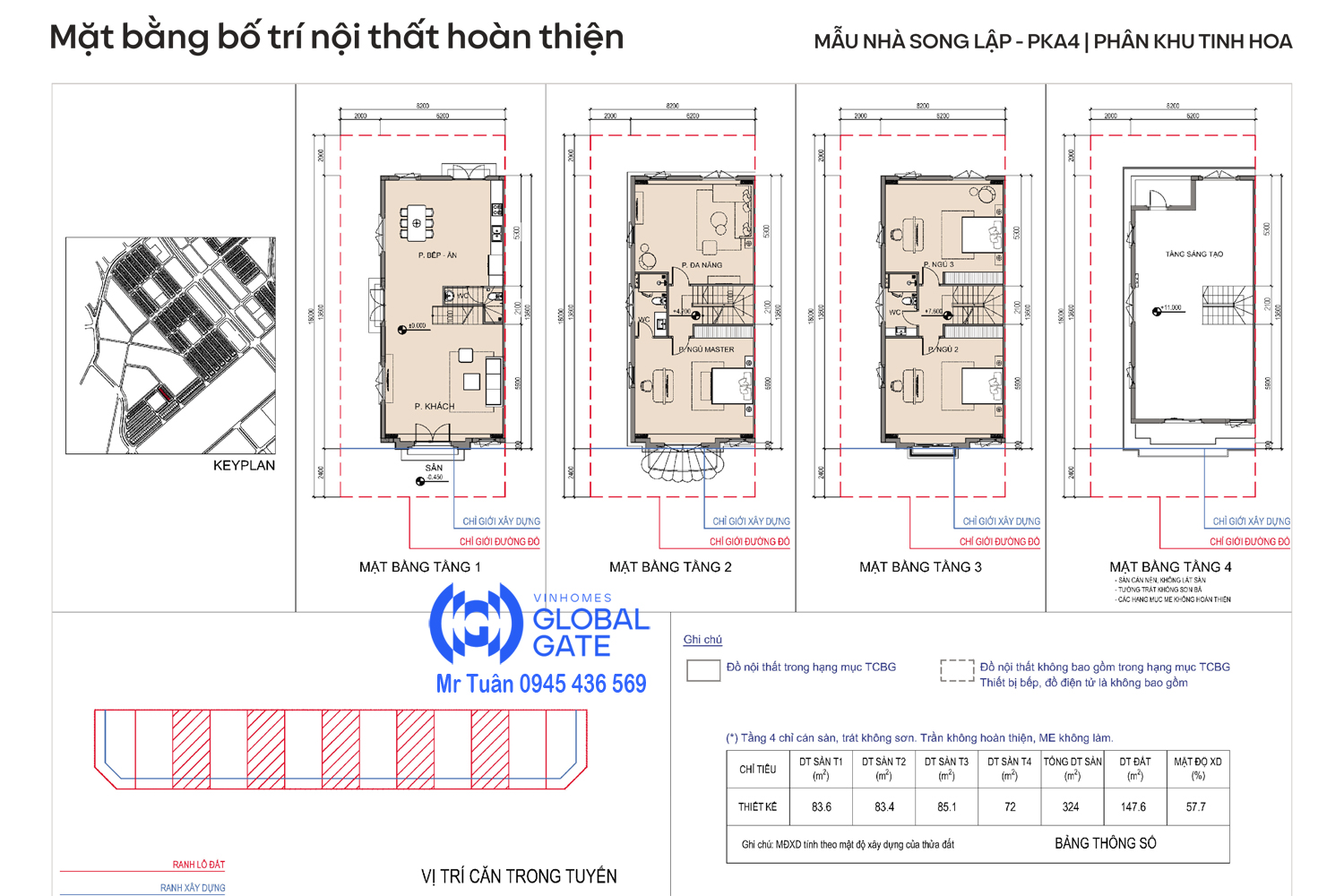 - Tổng DT xây dựng: 324 m2 (4 tầng)