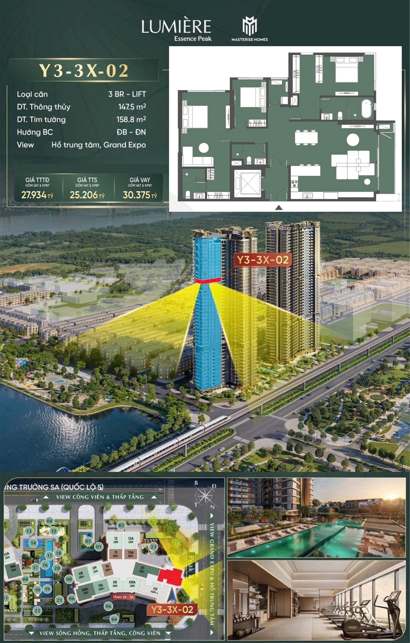 Căn 02 tòa Y3 (Góc 147,5m2 / 3 ngủ, view hồ, thang máy riêng) LUMIÈRE Essence Peak II