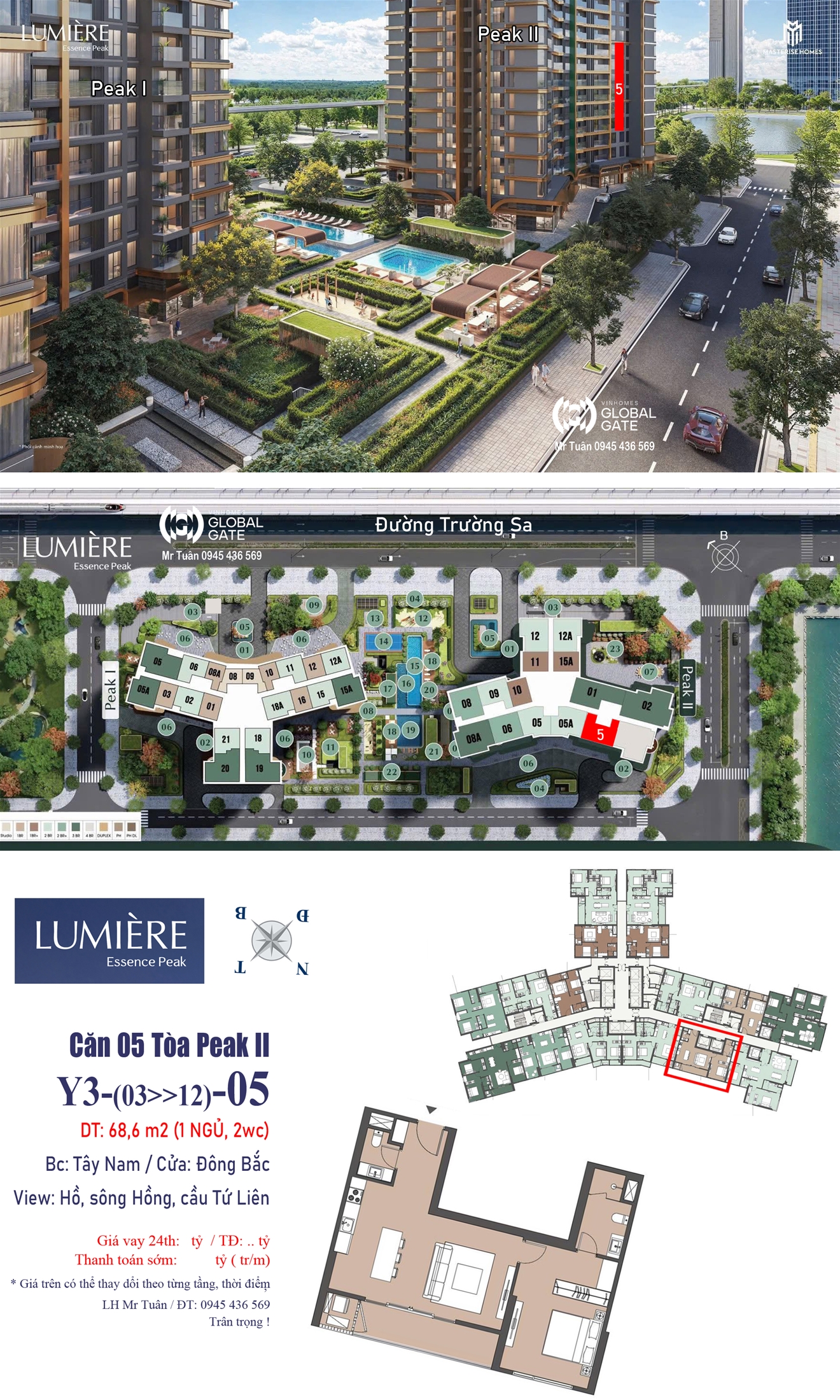 Căn 05 tòa Y3 view hồ (68,6 m2 / 1 ngủ, 2wc) LUMIÈRE Essence Peak II