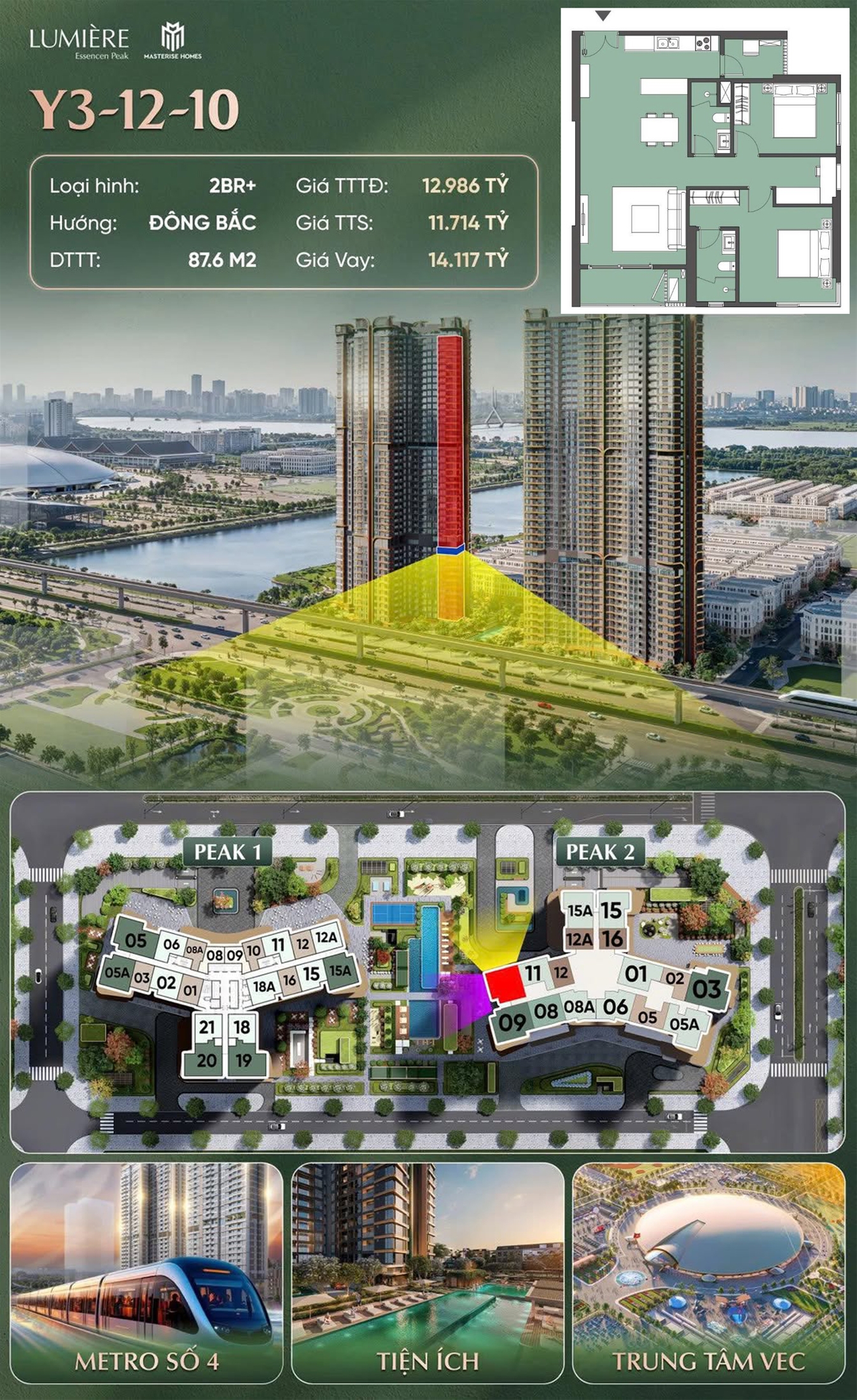 Căn 10 tòa Y3 LUMIÈRE Essence Peak II (Góc, 2 ngủ+ / 87,6m2 / TTS 11,714 TỶ)