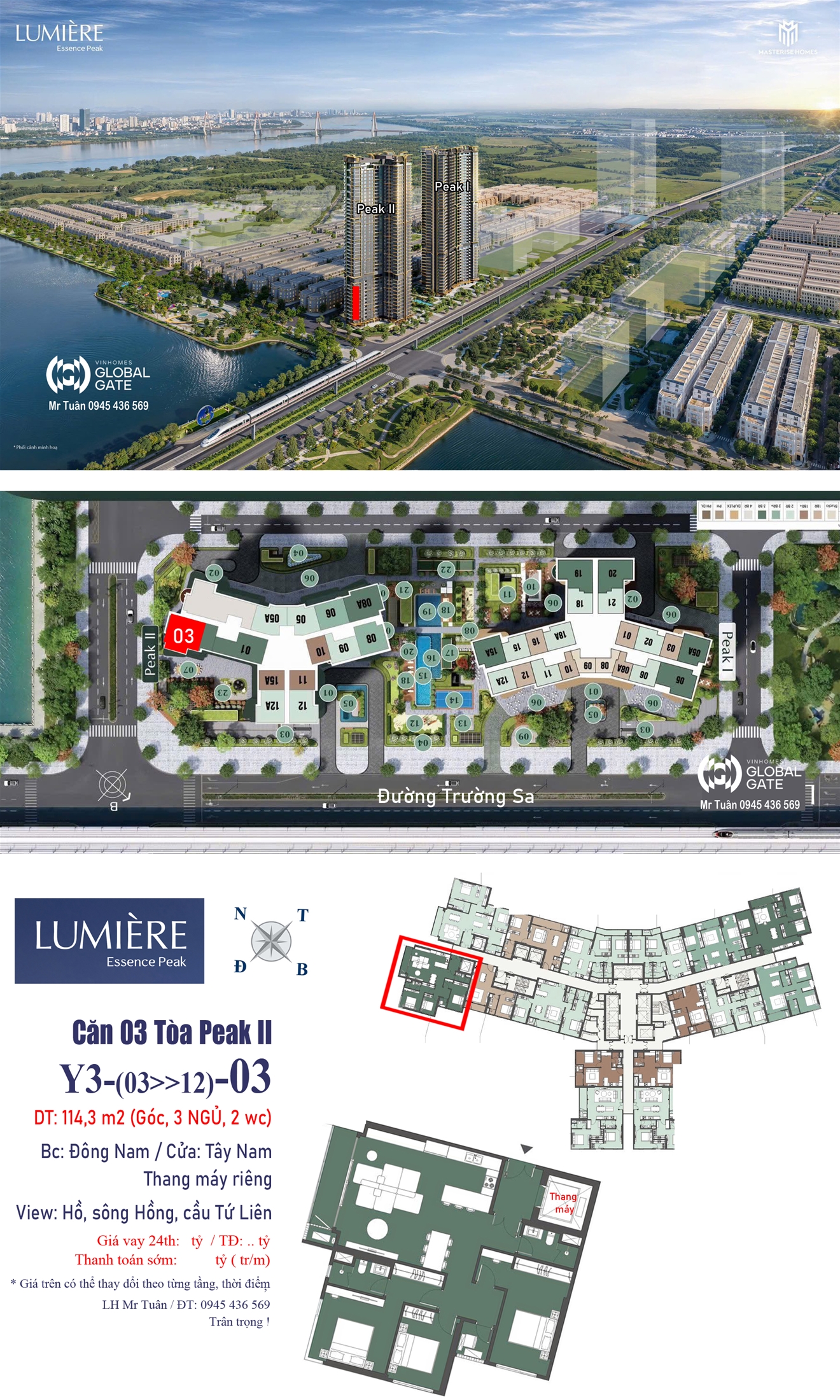Căn góc 03 tòa Y3 (114,3 m2 / 3 ngủ, view hồ, thang máy riêng) LUMIÈRE Essence Peak II